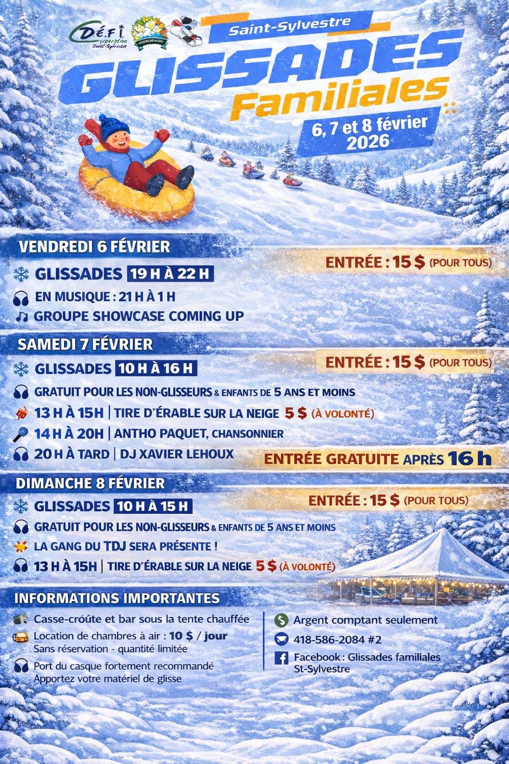 Pour information, contactez la municipalité au (418) 596-2384 #2 ou écrivez à loisirs@st-sylvestre.org et abonnez-vous à la page Facebook Glissades familiales Saint-Sylvestre.